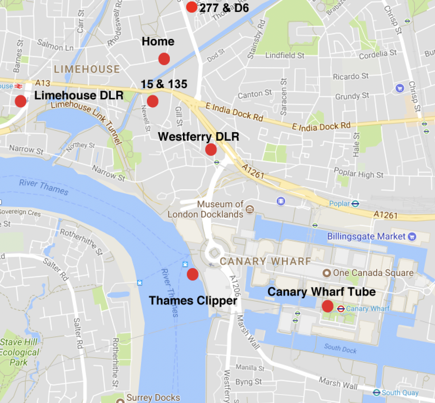 Number 15 Bus: Nice but slower route into town. Go out of flat, turn left and walk down Copenhagen Place, at the end turn left onto Salmon Lane (huge anchor in road), immediately turn left onto Commercial Road, cross at the pedestrian crossing. You will see the bus stop outside St. Anne’s Church. This is all of two-minute’s walk from the flat.