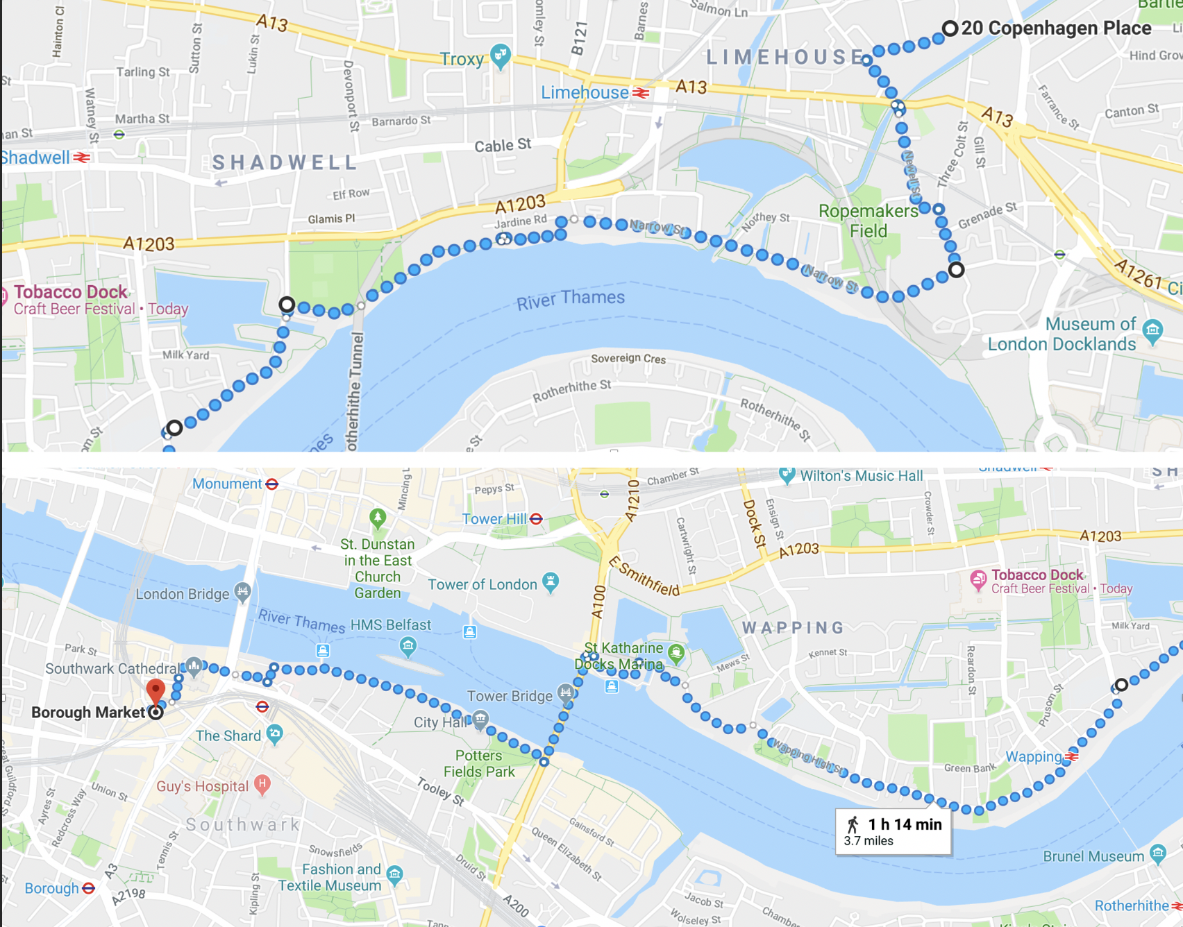 This route from the flat will take you along the river to Tower Bridge, The Tower of London, part of the Roman wall & Southwark Cathedral. You can duck off earlier and head to 40 Maltby Street, Bar Tazino or José places on Bemondsey Street. You will also walk past Restaurant Story. In Borough Market you have Padella, Wright Brothers and Turnips. (See South London food section for details). This route will also take you by the houses of Helen Mirran and Graham Norton in Wapping. Ian McKellan lives next to The Grapes pub.